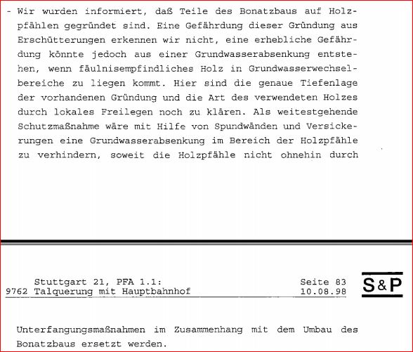 Zudem hat der Sachverständige des BUND, der Geologe Dr.Lueger bei der jüngsten Erörterung darauf hingewiesen, dass die Äüßeren, nach den Plänen der Bahn AG, schräg angeordnetet Pfähle (siehe Screenshot unten) für die Aufnahme seitliche Zugkräfte ausgelegt wurden. Bei einer Grundwasserabsenkung könnte die Eisenbewehrung dieser vermeintlichen Betonpfähle rosten und somit die Pfähle ihre geplante Trage-Funktion für den Turm nicht mehr ausreichend erfüllen.