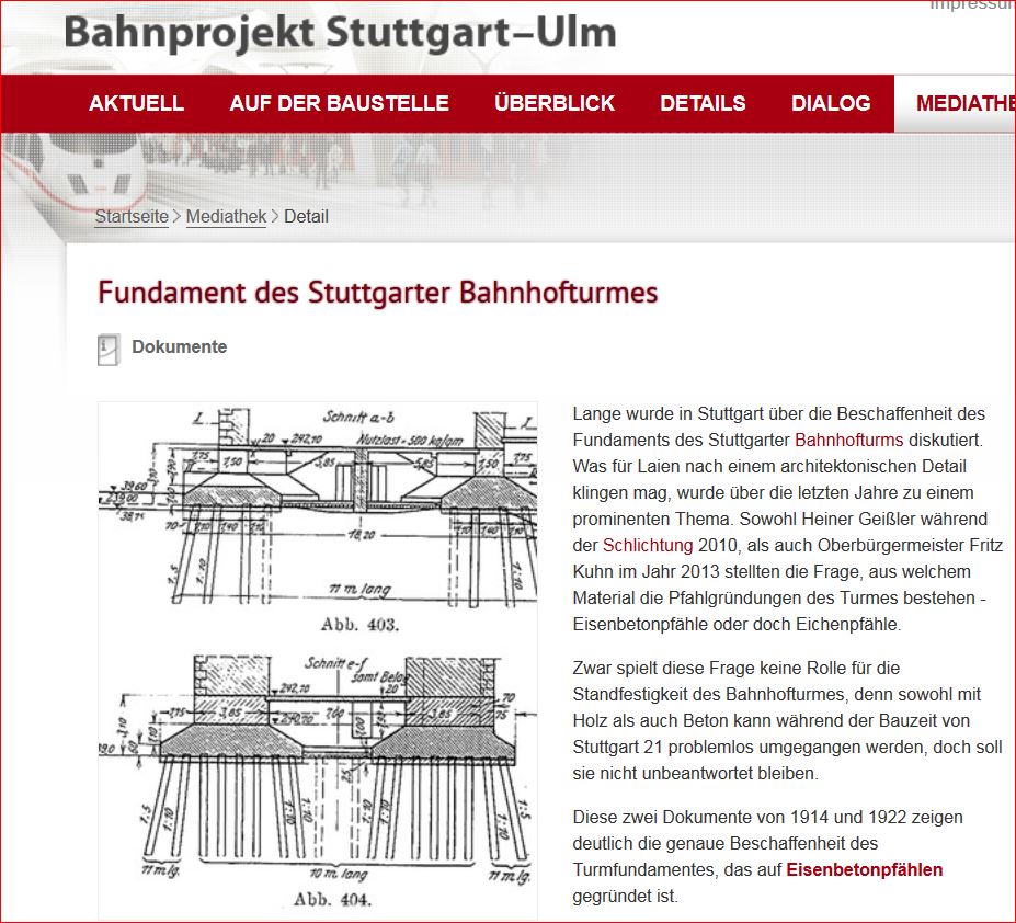 Die Deutsche Bahn AG behauptet anhand von einer verschiedenen Quellen sicher die Vewerwendung von Eisenbetonpfählen nachweisen zu können: Eine Fundamentberechnung aus dem Jahre 1914 und eine Sekundärquelle aus einer Fachzeitschrift aus dem Jahre 1922 [LINK]. Nach wissenschaftlichen Kriterien kann so etwas jedoch nicht als Beweis akzeptiert werden, da eine Berechnung im Vorfeld oder eine Sekundärquelle (Bauzeitschrift 6 Jahre nach Erstellung) ohne Verweis auf Originaldokumente der Bauausführung oder – Dokumentation letztendlich keinen wissenschaftlcihen Nachweis darstellen. Jeder kann sich vorstellen, wie bei z.B. beim Spiel „Stille Post" schon vergleichsweise rasch aus Eichenpfählen Eisenpfähle werden.
