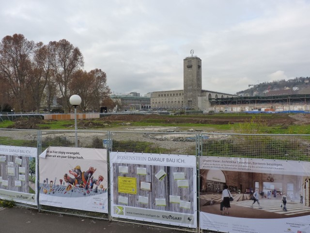 Bahnhofsturm hinter dem seit Februar 2012 geräumten und abgeholzten ehemaligen Mittleren Schloßgarten [Wikipedia: LINK]